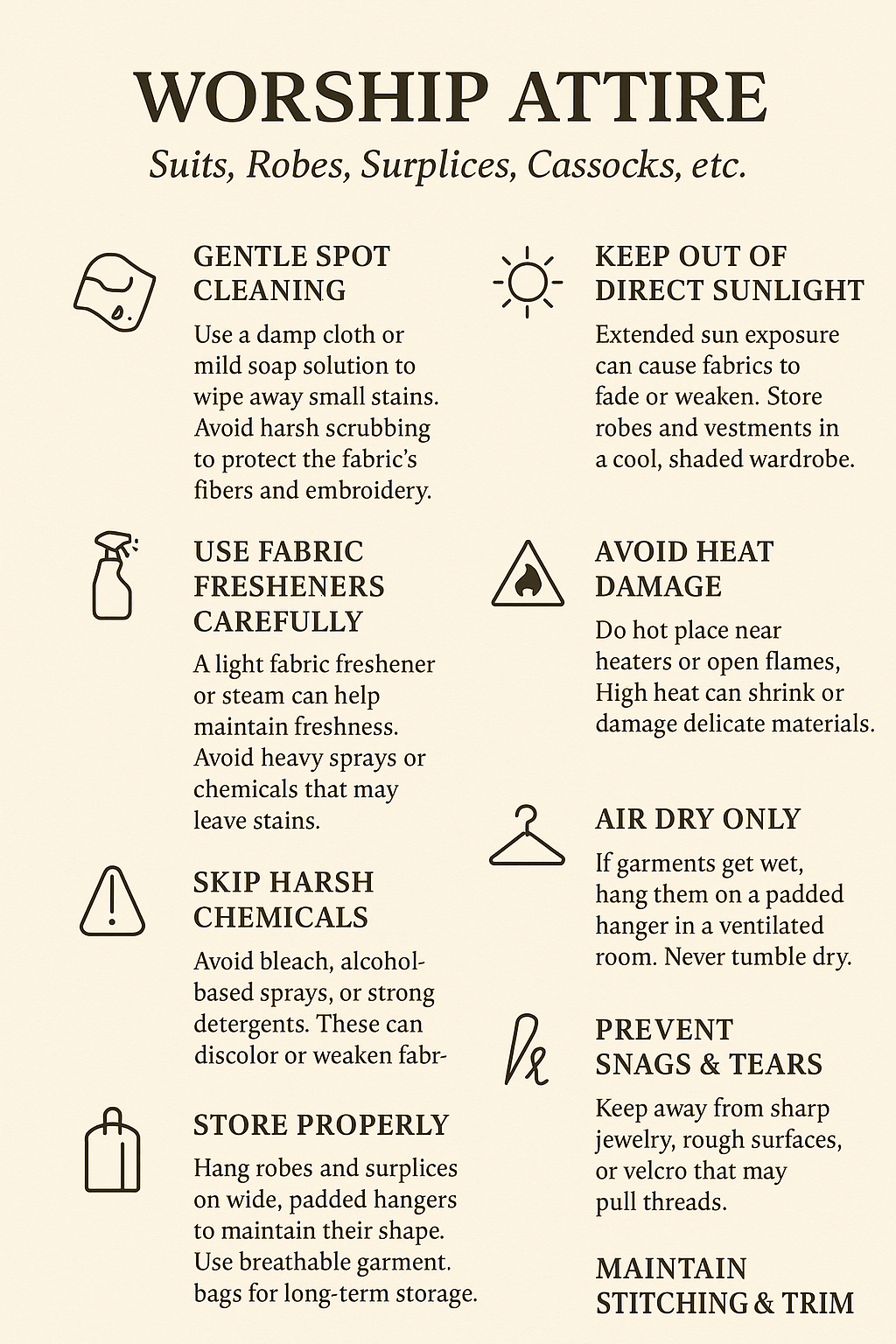 Check regularly for loose threads, buttons, or decorative trim. Prompt repairs will extend the life of your vestments.