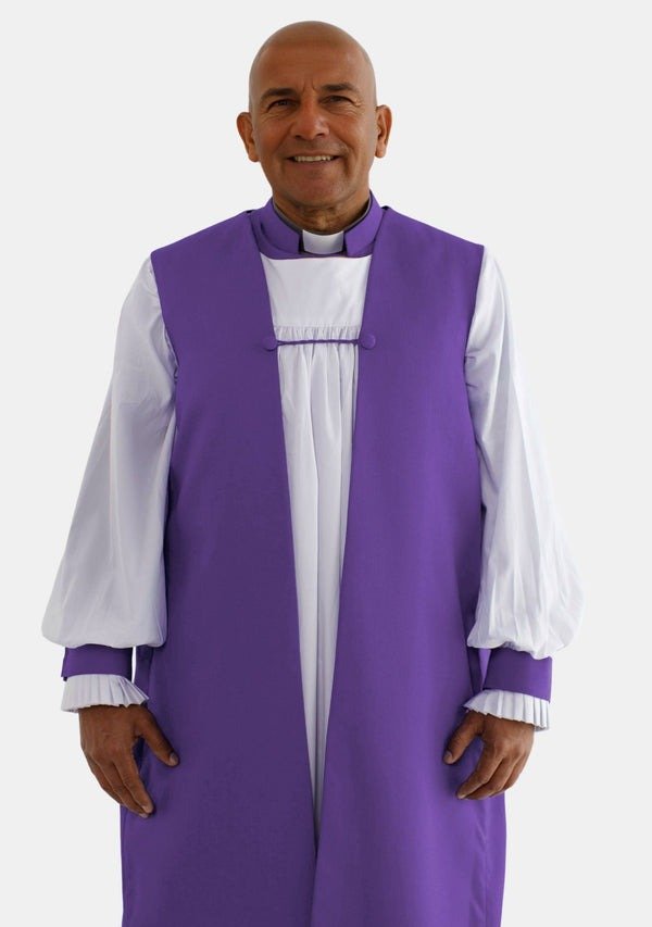 Both Red Purple and Roman Purple are colors that have held deep spiritual importance for centuries. They represent faith, humility, and the noble duty of service. The rich color palette of this Clergy Chimere, along with its flowing gathered back drape and braid trim details, gives it a classic and refined look. It embodies the essence of Anglican vestments, blending traditional symbolism with a fit that meets modern expectations. Whether worn for ordinations or special church services, it enhances the presence of every bishop who wears it.