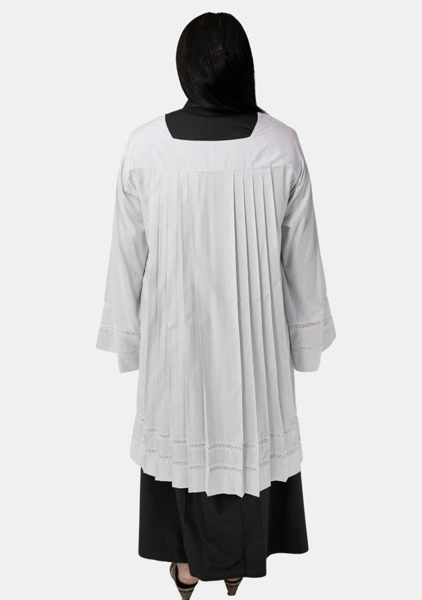 The Worship Attires Female Clerical Pleated Surplice seamlessly reflects elegance, devotion, and artistry under sacred appointments. This garment is uniquely designed for women in ministry and is a balanced integration of classic style and contemporary ease. The refined square neckline with ten pleats on the front and back of the garment is elegant, while the surplice’s sleeves and full-cut body offer ease of movement in a busy clerical setting. This surplice is essential for the ecclesiastical wardrobe, providing spiritual dignity and professional refinement during every service.
